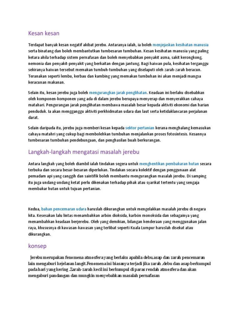 Langkah langkah yang perlu diambil bagi mengelakkan masalah jerebu daripada berlaku. Langkah langkah mengelakkan masalah hubungan etnik dan. Apakah kesan dari fenomena jerebu kepada manusia alam sekitar dan ekonomi di kawasan yang dilanda jerebu terutama di semenanjung malaysia. Bagi menyelesaikan masalah jerebu yang merunsingkan ini semua pihak harus bersinergi dalam mengatasi masalah tersebut persis kata orang orang tua berat sama dipikul ringan sama dijinjing. Apakah langkah yang wajar diambil bagi mengatasi dan mengawal daripada berlakunya masalah jerebu.