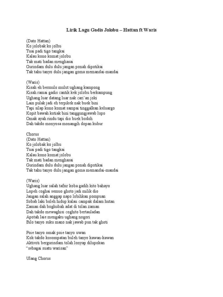 Lirik lagu gadis jolobu. Lirik lagu satu hari di rembau waris feat karmal juzzthin adeep nahar mark adam. Lirik lagu subhanallah raqib majid waris. Lirik lagu gadis jolobu waris hattan. Lirik gadis jolobu waris ft dato hattan lirik gadis jolobu waris ft dato hattan dato hattan ko jolobak ko jolobu tuai padi tigo tangkai kalau kono komat jolobu tak mati badan menghasai.