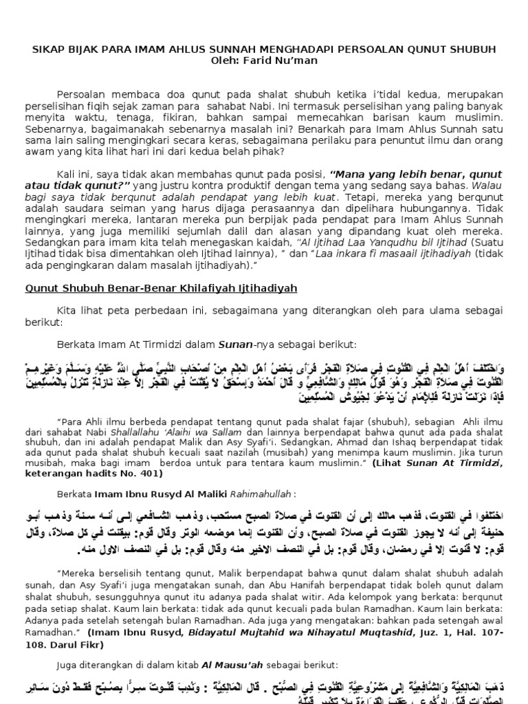 Sikap Bijak Para Imam Ahlus Sunnah Menghadapi Persoalan Qunut Shubuh