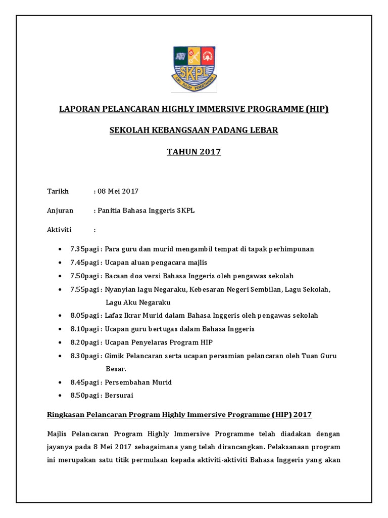 Laporan Pelancaran Highly Immersive Programme Hip Sekolah Kebangsaan Padang Lebar Tahun 2017