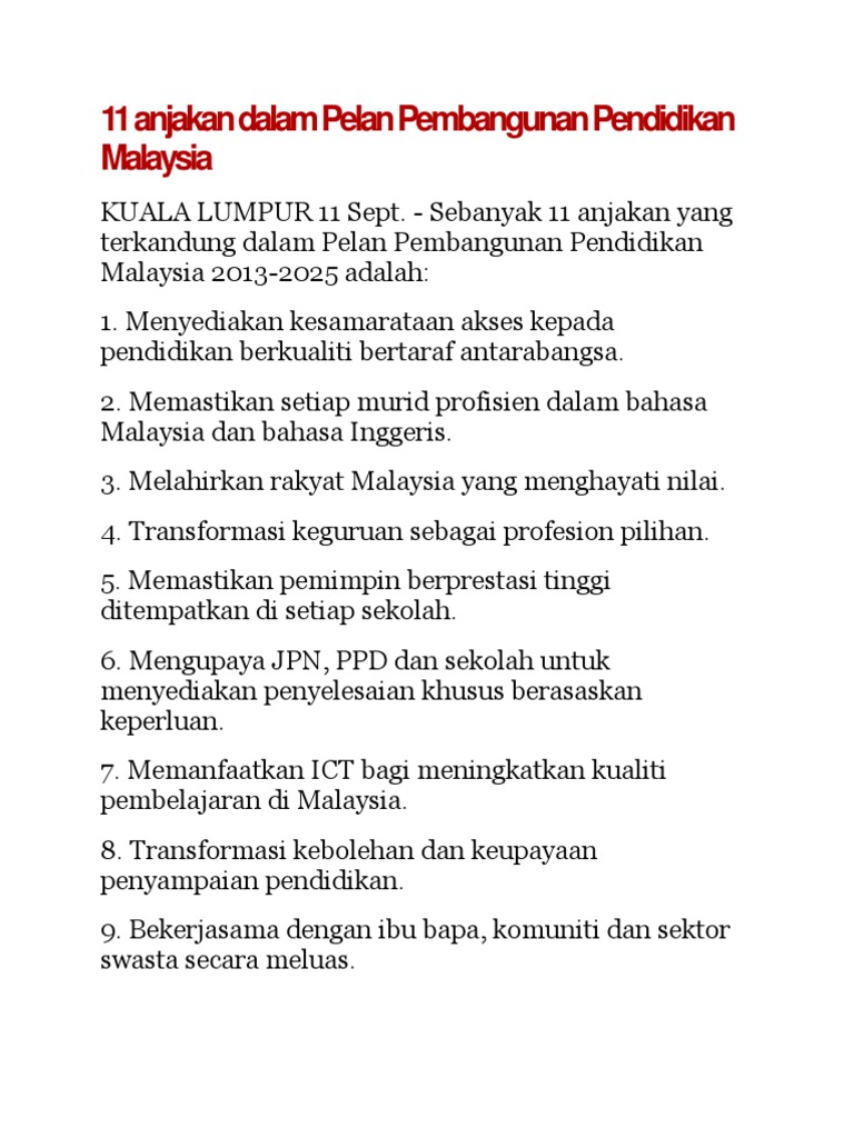 11 Anjakan Dalam Pelan Pembangunan Pendidikan Malaysia